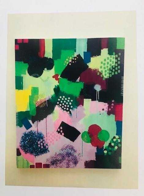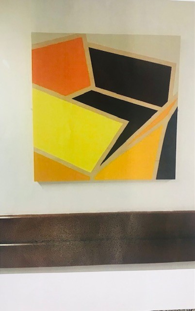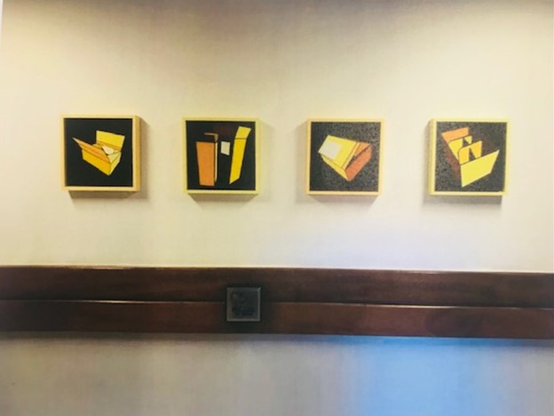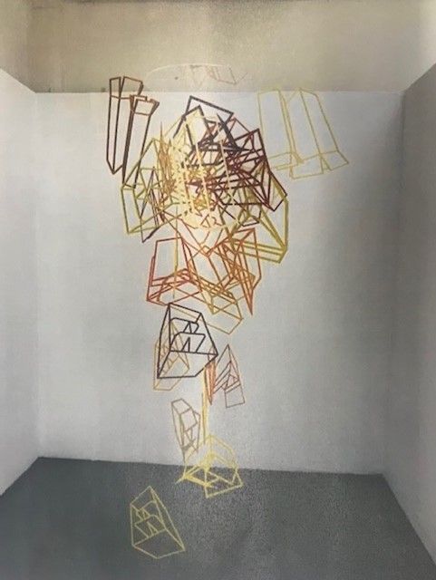 May Beveridge’s work was the first work in the studio consisting of 3 images on board and an installation at the centre of her section of the studio. The natural light was on the far end of the studio but the studio lights caught the hanging sections of painted MDF and projected interesting shadows on the wall. The plastic cord and transparent plastic from which the installation was attached was barely visible so amplified the feeling that the boxes were in a suspension. The college had displayed some more work in the corridors which added up to 10 more works on the same theme of cardboard boxes. In the same studio Alison Wilkinson’s oil paintings were displayed in the space nearest to the natural light from the windows out to the quadrangle. The four large paintings selected on 3 walls was an excellent use of the space and the light.